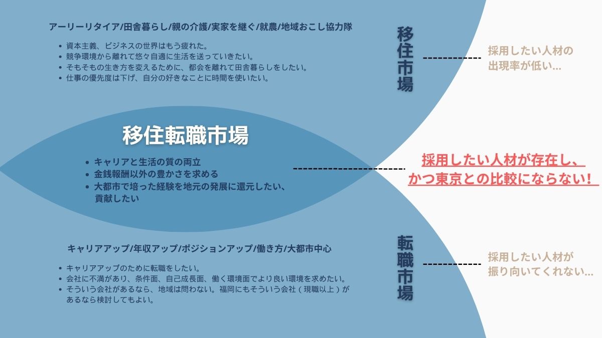 「移住だけ」を主たる文脈として採用活動を行えば、課題解決人材の出現率は限りなく低いと言えます。また、世間のハイクラス転職市場では東京などの大都市と条件競争へ。移住転職の市場はそのどちらでもなく、確実に存在しています。しかしながら、多くの地方企業がこのマーケットへのアプローチしながらも苦戦している事実があります。